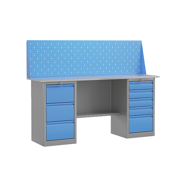 - Верстак комплектуется перфорированным экраном, на котором можно подвешивать различные аксессуары и инструменты, обеспечивая удобство доступа к необходимому оборудованию.