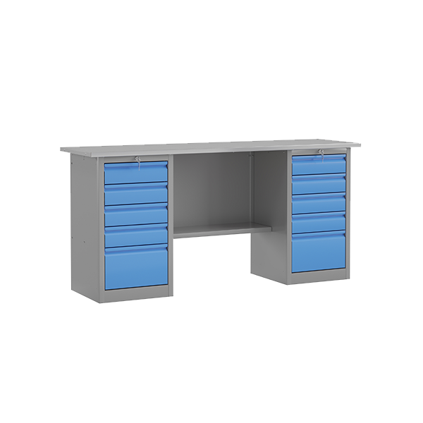 - В комплекте есть открытая нижняя полка и две тумбы с 5 выдвижными ящиками, каждая тумба содержит центральный замок.