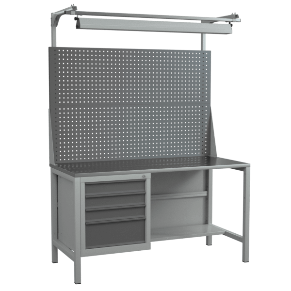 - Оснащён оцинкованной столешницей, одной тумбой, двойным перфорированным экраном и светодиодным светильником.