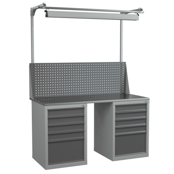 Верстак 1500 с 2 тумбами с выдвижными ящиками, светильником и экраном
