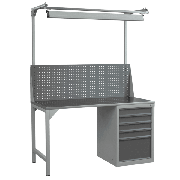 - Оснащён оцинкованной столешницей, тумбой с 5 выдвижными ящиками, перфорированным экраном с консолями и светодиодным светильником.