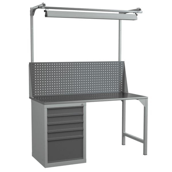 Верстак 1500 с тумбой с выдвижными ящиками, светильником и экраном с консолями