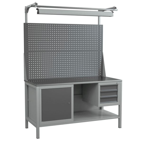 Верстак 1500 со светильником, двойным экраном, полкой и 2 тумбами