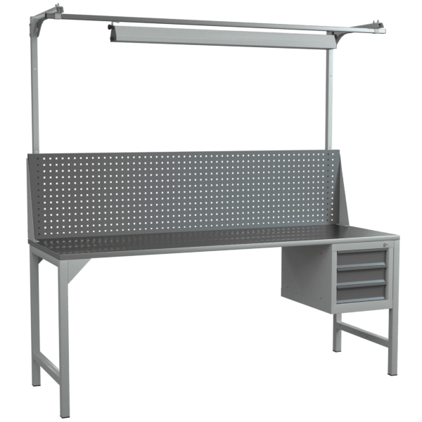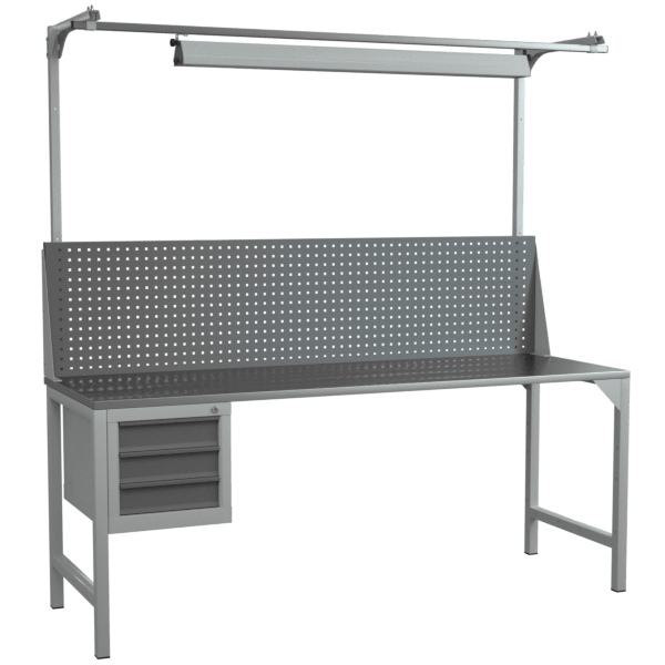 Верстак 2000 со светильником, экраном с консолями и подвесной тумбой с выдвижными ящиками