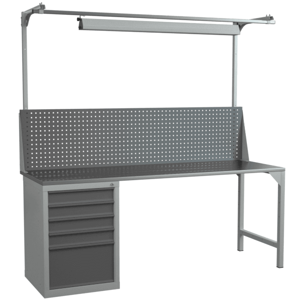 Верстак 2000 со светильником, экраном с консолями и тумбой с 5 выдвижными ящиками