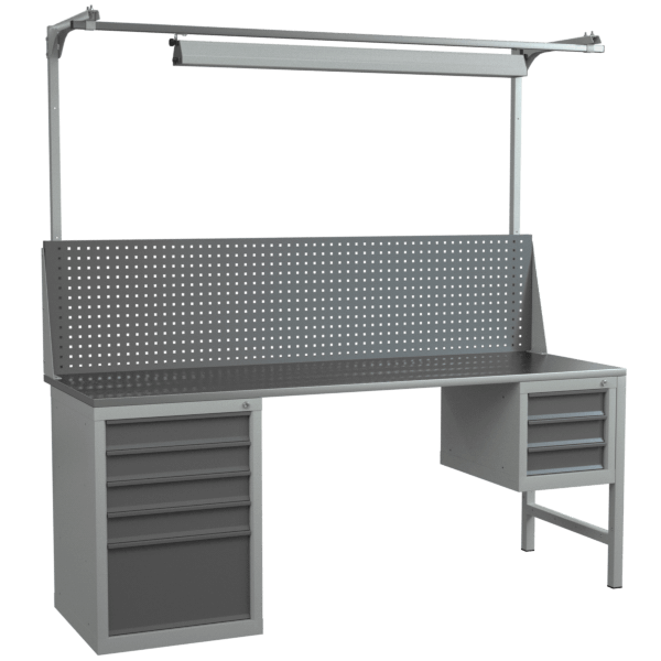 Верстак 2000 со светильником, экраном, тумбой с 5 ящиками и подвесной тумбой с 3 ящиками