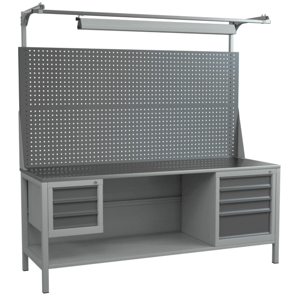 Верстак 2000 со светильником, полкой, двойным экраном, тумбой с 4 выдвижными ящиками, подвесной тумбой с 3 ящиками