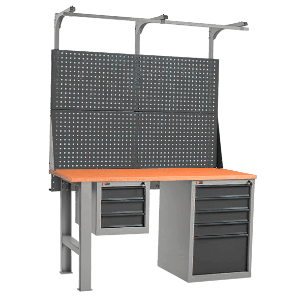 - На верстак устанавливается перфорированный экран, подвесная тумба с тремя выдвижными ящиками и консоль.