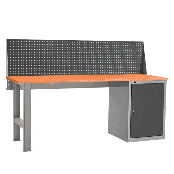 - В качестве одной из опор служит инструментальная тумба с двумя полками и распашной дверцей.