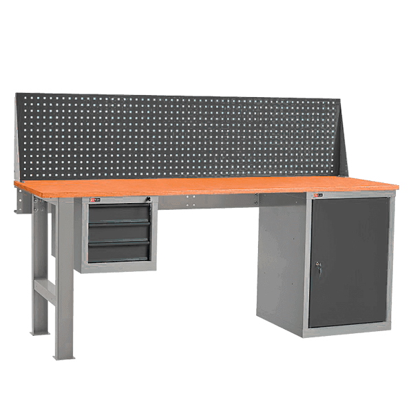 - На верстак устанавливается перфорированный экран и подвесная тумба с тремя выдвижными ящиками.