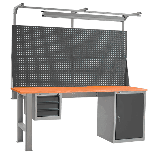 - На верстак устанавливается перфорированный экран, консоль и подвесная тумба с тремя выдвижными ящиками.