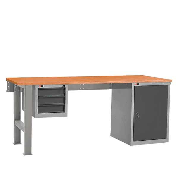 - Верстак комплектуется подвесной тумбой с тремя выдвижными ящиками.