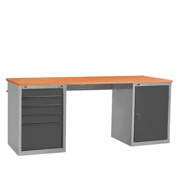 - Опоры для столешницы: инструментальная тумба с двумя полками и распашной дверцей и тумба с пятью выдвижными ящиками.