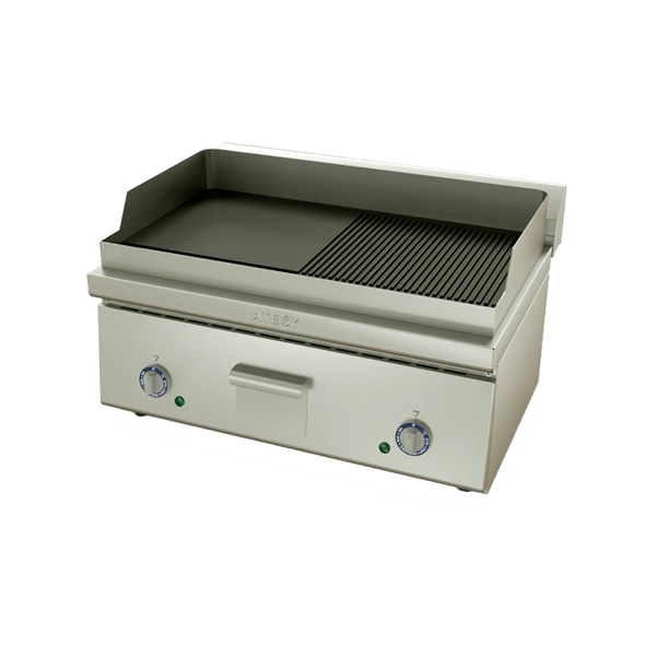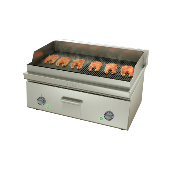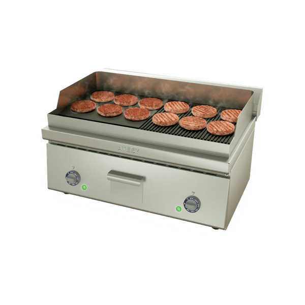 - Сборная электросковорода из нержавеющей стали с рифленой и гладкой зоной используется для приготовления стейков из мяса и рыбы, сосисок, колбасок, сарделек, шпикачек, котлет для бургеров и овощей-гриль.